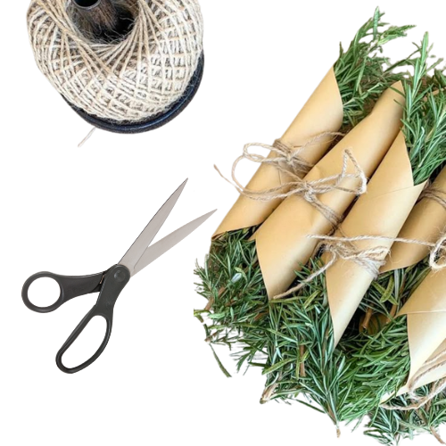 Sencillo, rústico y ecológico. Este empaque elaborado con papel kraft y cordel natural es ideal para presentar hierbas frescas. Su diseño artesanal resalta lo natural del producto, aportando un toque sostenible y atractivo para regalos o productos gourmet. Perfecto para marcas conscientes y presentaciones creativas.